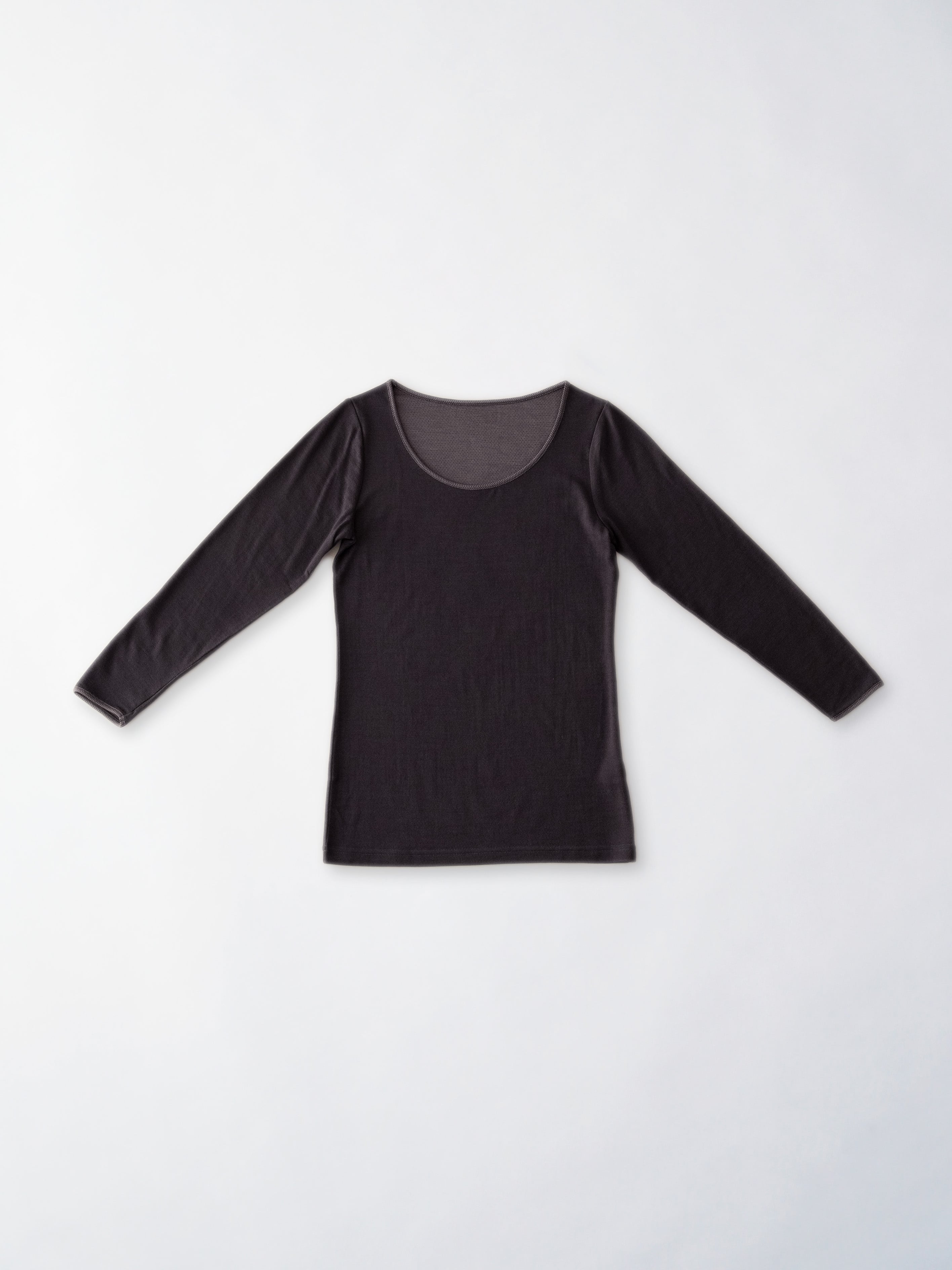 肌に触れる内側をシルク100%、外側を上質なウール100%の特殊な2重構造の生地で仕立てました。繊維の間に空気をたくさん含むので、ガーゼのようにふんわり柔らかく軽い着心地です。着丈はヒップが隠れるほどの長さで伸びも良く、ボディに優しくフィットします。とても温かいのですが、吸湿・放湿性に優れているので汗をかいてもゾクっとせず、すぐに乾いてサラサラ快適に過ごせます。また、保温・保湿にも優れているので、寒い時期にオススメのシルクです。